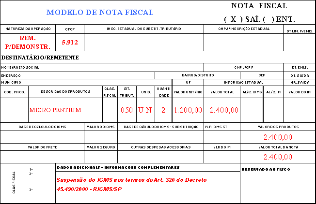Na saída de mercadoria a titulo de demonstração, promovida por estabelecimento comercial ou industrial, será emitida Nota Fiscal, sem o destaque do valor do imposto :