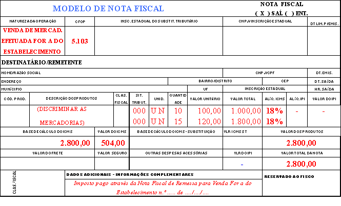 Por ocasião das vendas das mercadorias, aos seus adquirentes finais, deverá ser emitida nota fiscal, que terá, na operação interna, como Código Fiscal e Natureza da Operação, “5.103” ou “5.104, “Venda de Produção Própria, efetuada Fora do Estabelecimento” ou “Venda de Mercadorias adquiridas ou recebidas de Terceiros, efetuada fora do Estabelecimento”, destacando-se o valor do ICMS e indicando-se os dados da nota fiscal relativa à remessa. Essas notas fiscais poderão ser emitidas sem o destaque do IPI, desde que declarem, além dos dados da Nota Fiscal de Remessa, conforme descrito anteriormente, que o imposto se acha incluído no valor dos produtos. Releva notar que, para esses casos, o estabelecimento não está obrigado à emissão de Cupom Fiscal ECF, devendo, portanto, proceder a emissão da correspondente Nota Fiscal, modelo 1 ou 1-A, ou, mediante regime especial, que deverá ser previamente solicitado perante o Fisco, poderá solicitar, se assim desejar, autorização para emitir o Cupom Fiscal. A Nota Fiscal de Consumidor, modelo 2, somente poderá ser emitida em substituição ao Cupom Fiscal, qualquer que seja o seu valor, valendo dizer, portanto, que só os estabelecimentos obrigados ao ECF é que poderão vir a utilizá-la.