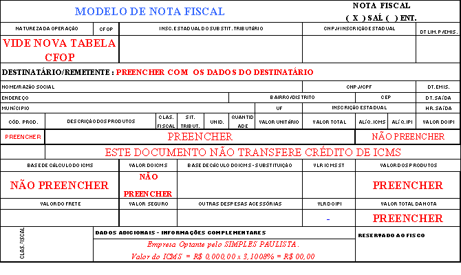 As empresas enquadradas no SIMPLES PAULISTA deverão emitir notas fiscais conforme modelo abaixo. Deverá ser utilizada a Nova Tabela de Códigos Fiscais utilizadas também pelas demais empresas.
