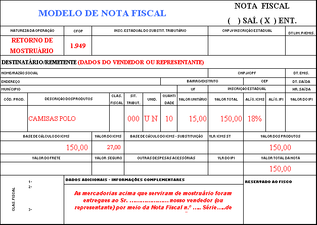 Por ocasião do retorno, o estabelecimento remetente deverá emitir nota fiscal de Retorno de Mostruário conforme abaixo :