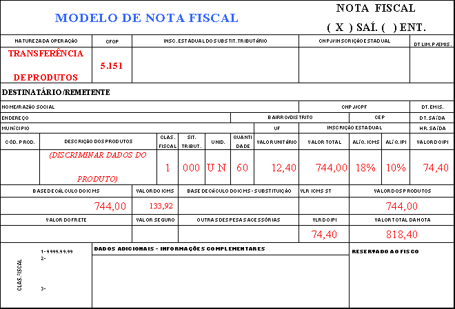NATUREZA DA OPERAÇÃO :TRANSFERÊNCIA DE PRODUTOS CFOP : 5.151 (Operações Internas). 6.151 (Operações Interestaduais). ICMS/IPI : Tributável