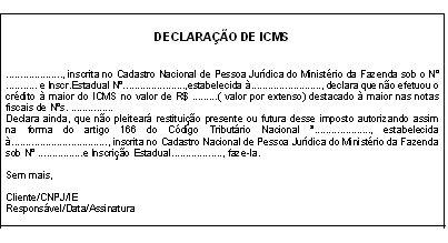 Toda vez que a empresa fornecedora destacar ICMS a maior, o destinatário deverá apropriar-se somente do valor correto, e quanto a diferença não creditada deverá ser elaborada uma declaração cujo modelo segue abaixo :