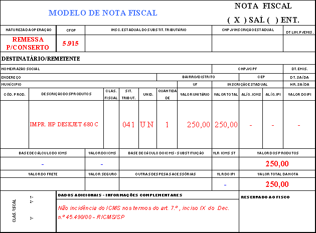 DA OPERAÇÃO : REMESSA PARA CONSERTO